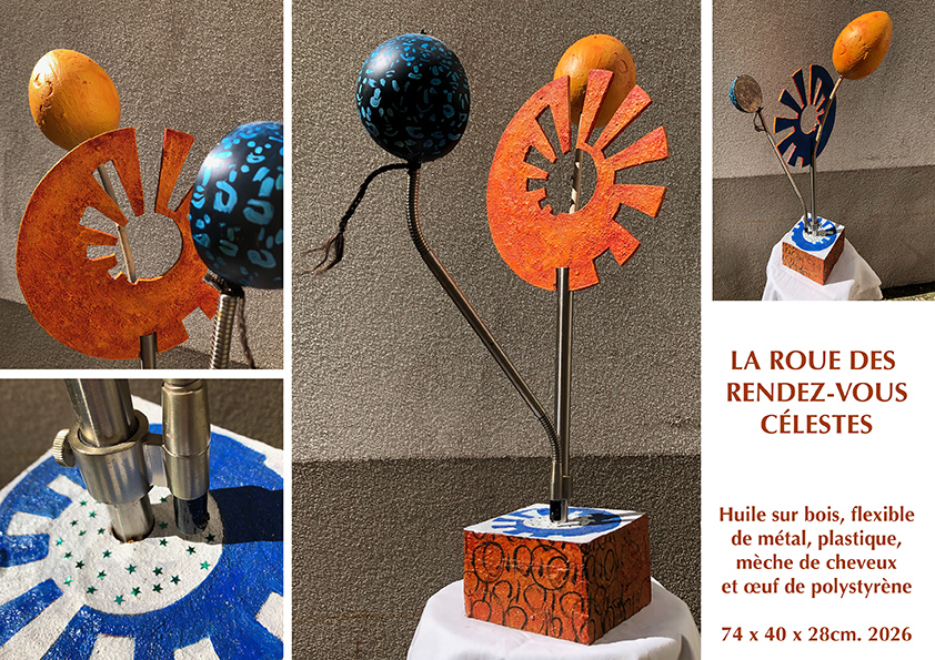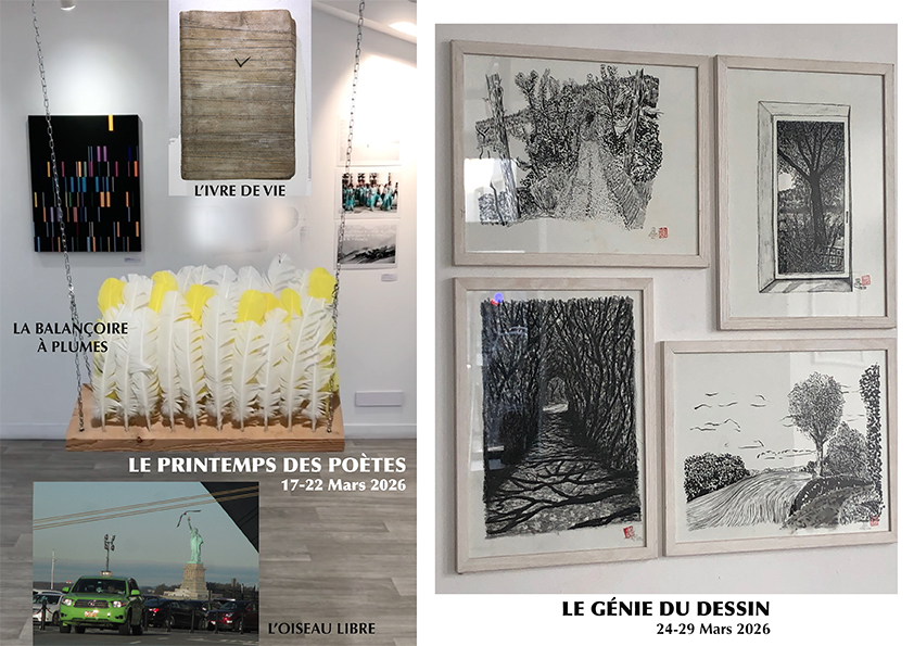 L’entrée du printemps s’est faite cette année sous le signe de deux expositions collectives à La Galerie du Génie de la Bastille. Ce fut d’abord le Printemps des Poètes dont le motif était cette année « La Liberté. Force vive déployée ». Outre une photo (L’oiseau Libre) déjà montrée dans ces pages et une peinture/livre (L’Ivre de Vie) que vous pouvez voir dans l’image n°1, j’avais accroché au plafond de la galerie une Balançoire à Plumes, manière de rejoindre dans un clin d’œil souriant l’univers des oiseaux, eux qui possèdent un degré de liberté du plus que nous, pauvres humains, collés au sol par la gravité (sauf les quatre astronautes d’Artémis qui au moment d’un lever de Terre sur la face cachée de la Lune ont envoyé un salutaire message d’amour à l’humanité qui n’a pas pour autant cesser de ne pas cesser le feu).